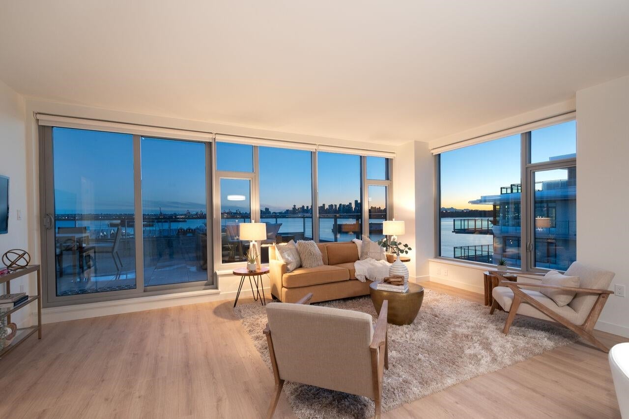 STUNNING WATERFRONT BRAND NEW 3 Bdrm, 3 bath almost 1600sf corner suite with a wall of windows to your expansive view to dtn Van! Imagine sipping your morning coffee, or glass of wine with family & friends, BBQing on your private massive square sunny south facing unobstructed waterfront 664 outdoor space, all watching arriving cruise ships, float planes & gorgeous sunsets! Just finished Bosa/Concert West Coast Modern w/ concierge, rooftop terrace social lounge, gym, bike & private locker plus EV ready secured Pkg included. Kings Mill Off Leash Dog Park out your door onto the 35 km Spirit Trail, walking 10 min to dining & shopping at Lonsdale Quay & Shipyards, or jump on the Seabus to Downtown Vancouver. Bring your Realtor to the next Open House Sat/Sun April 11/12 2-4pm.